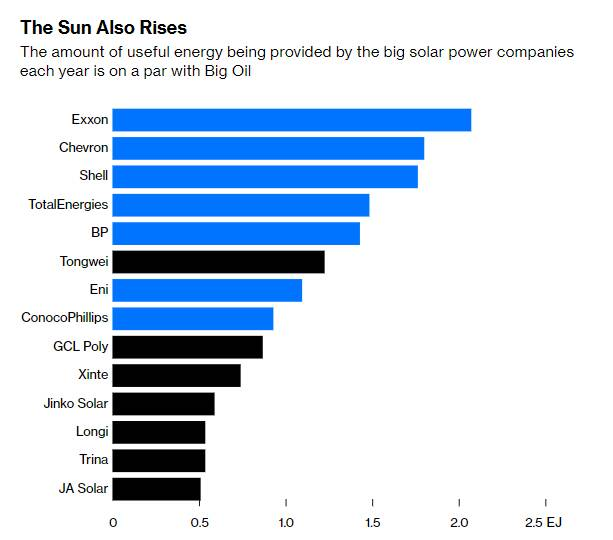 When comparing the energy production of these two groups of companies, the results are astonishing. Based on annual useful energy output, the largest polysilicon producer, Tongwei Co., can already compete head-on with some of the largest Western oil companies like BP, Eni, and ConocoPhillips, while other solar panel manufacturers are not far behind. If Tongwei continues with its plan announced in December 2023 to build a 400,000-ton high-purity silicon project and supporting facilities, nearly doubling its current production, it could even surpass ExxonMobil, the "big brother" of the Western oil industry.