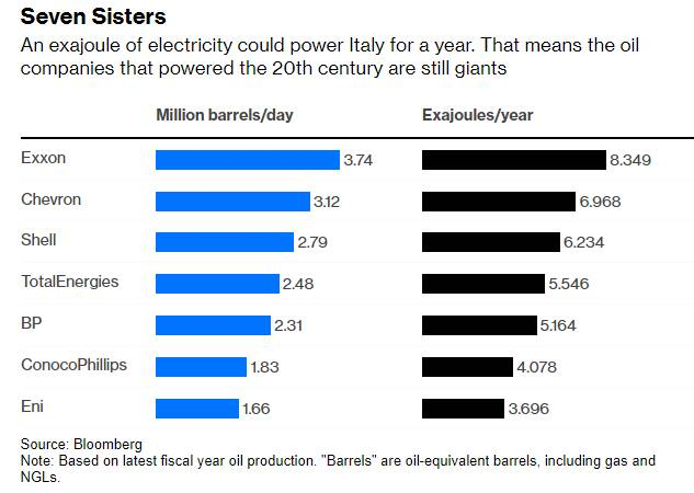 To understand this comparison, one can convert the production of each barrel of crude oil or cubic meter of natural gas by large oil companies into a unit of energy measurement — exajoules. One exajoule of electricity can power a country like Australia or Italy for a year. Large oil companies are producing significant amounts of this energy: ExxonMobil produces approximately 8.3 exajoules annually, while Shell produces around 6.2 exajoules per year.