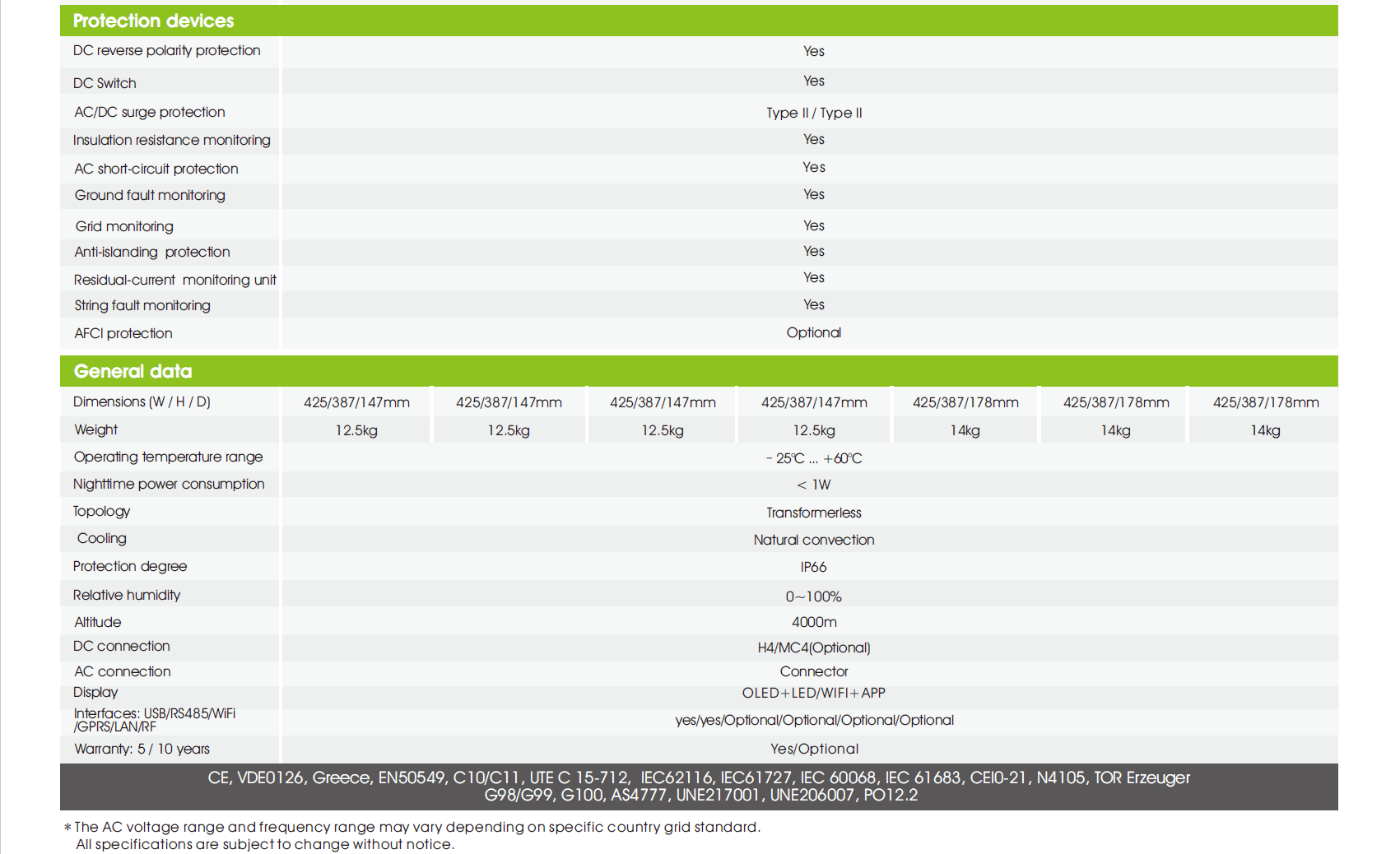 Certificate: CE, VDE0126, Greece, EN50549, C10/C11, UTE C 15-712, IEC62116, IEC61727, IEC 60068, IEC 61683, CEI0-21, N4105, TOR Erzeuger, G98/G99, G100, AS4777, UNE217001, UNE206007, PO12.2