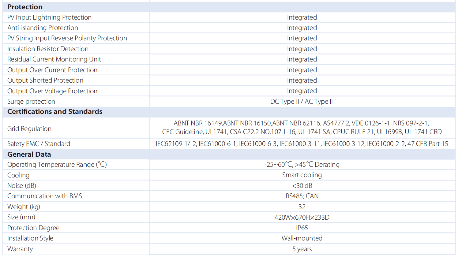 PV lightning protection / Anti-islanding protection / Leakage current protection / IP65 protection/ Automatically switch from Grid-Tied to Off-Grid mode within 5ms.