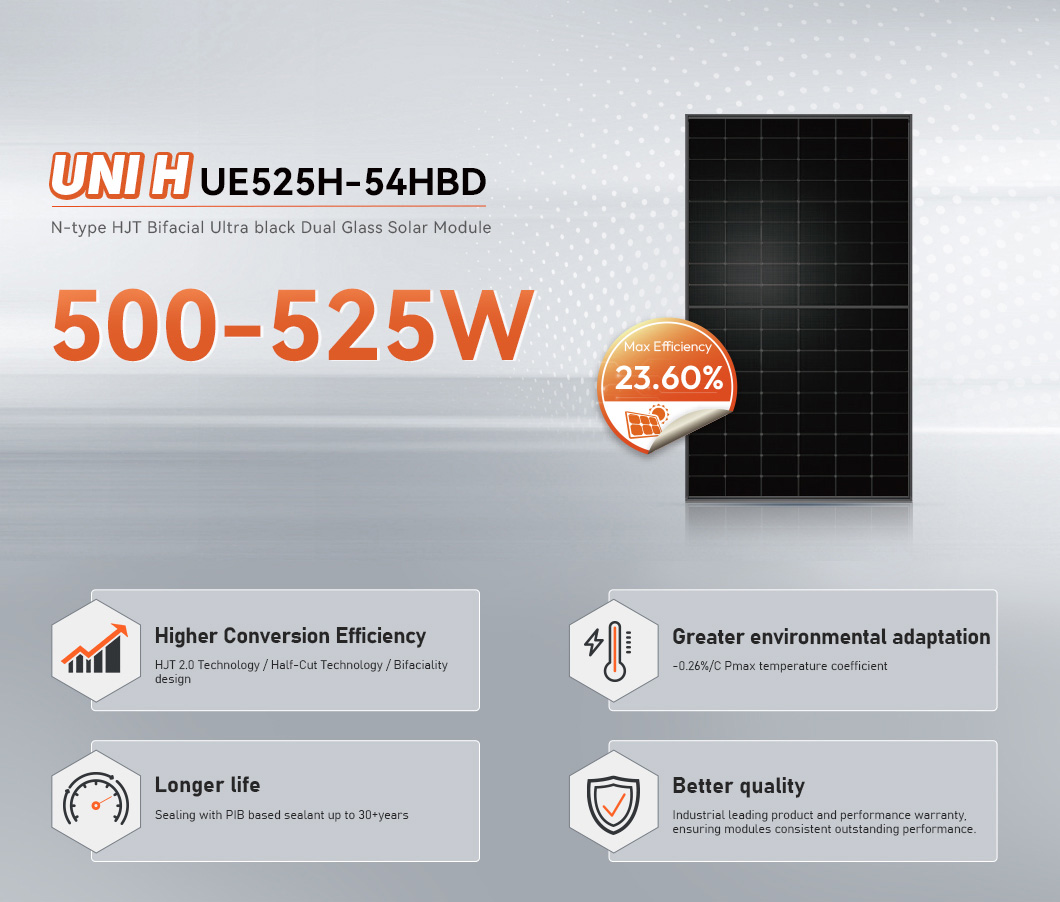 HJT is an abbreviation for Heterojunction Technology, representing an N-type monocrystalline double-sided solar cell. It boasts the advantages of simple processing, high power generation, and low cost per unit of electricity. It is poised to become an industry focal point following PERC cells. This type of solar cell was initially successfully developed in 1990, achieving a conversion efficiency of up to 14.5% for a 4mm2 cell at that time. Through continuous improvements, the conversion efficiency of HJT solar panels has reached 26.5% in 2022, with an average efficiency of 24.95% and a yield rate of 96.4%.