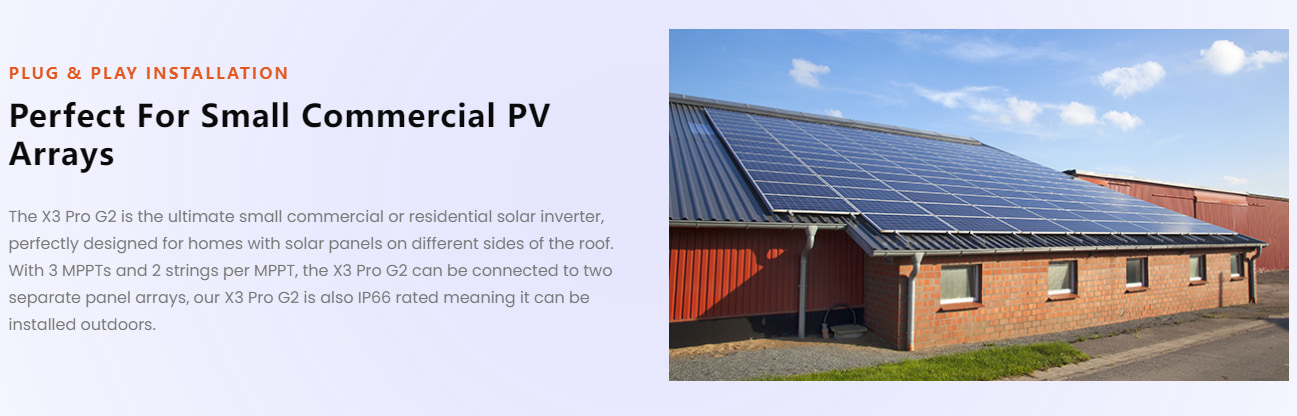 The X3 Pro is the ultimate small commercial or residential solar inverter, perfectly designed for homes with solar panels on different sides of the roof. With 3 MPPTs and 2 strings per MPPT, the X3 Pro can be connected to two separate panel arrays, our X3 Pro is also IP66 rated meaning it can be installed outdoors.