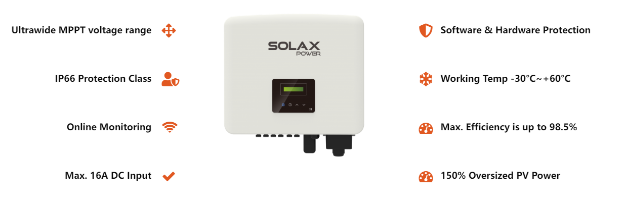 X3-Pro G2 8-30kwThe SolaX three phase inverters boast a wide MPPT voltage range to allow for more energy harvesting and have a maximum input voltage of 1100V, with a maximum efficiency of 98.5%.