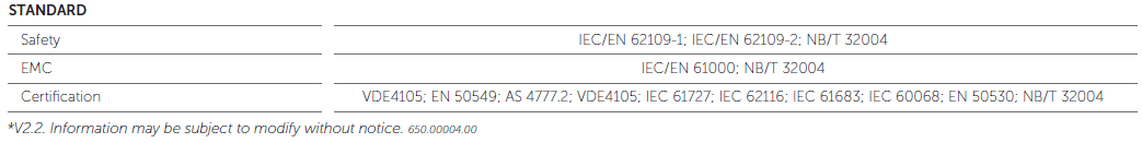 Certification : VDE4105; EN 50549; AS 4777.2; VDE4105; IEC 61727; IEC 62116; IEC 61683; IEC 60068; EN 50530; NB/T 32004