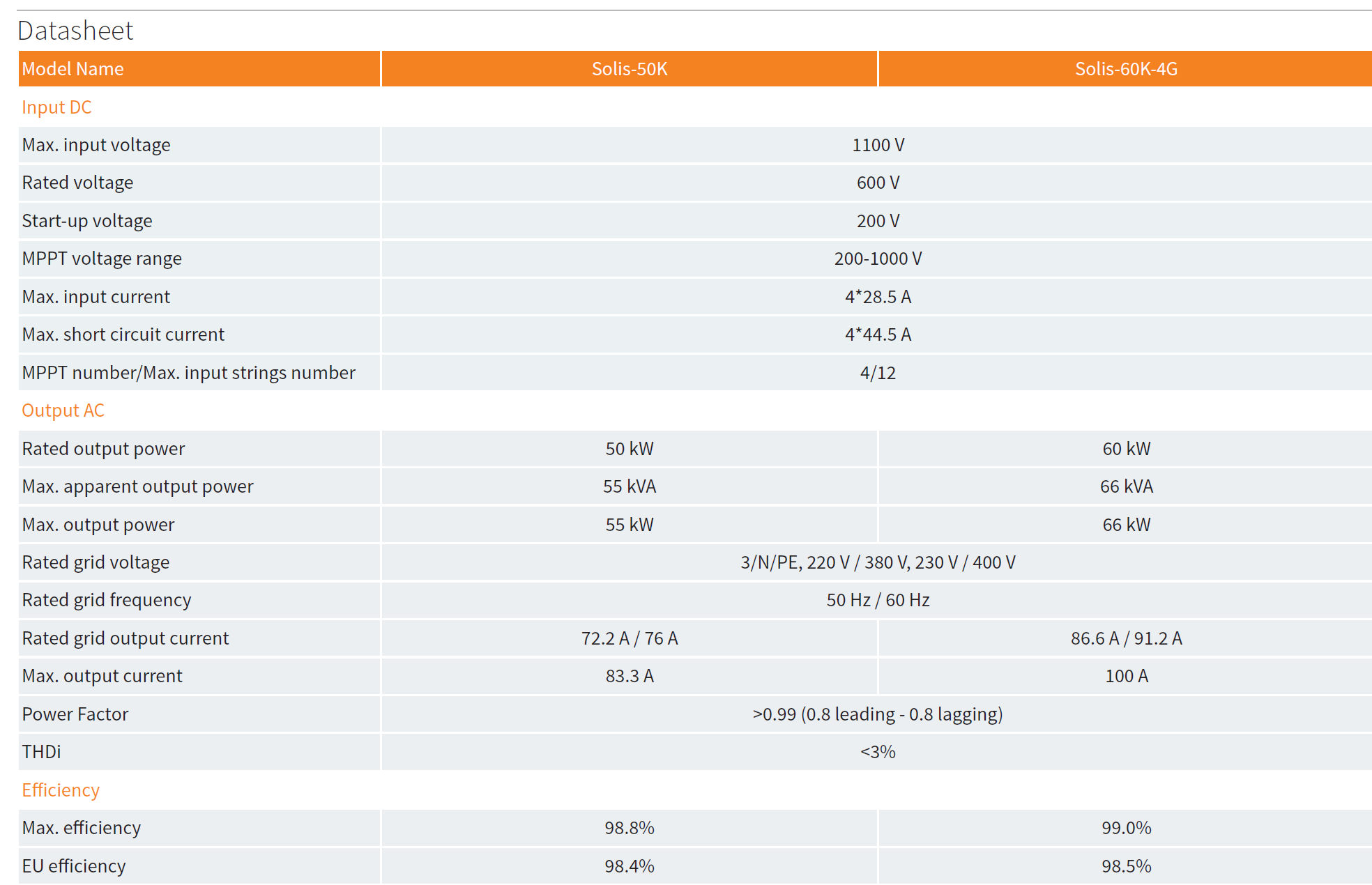 Solis-50K/60KSolis 4G inverter THDi<3, low harmonic distortion against grid. Adopt anti-resonance,signle transformer can connect 6M+ in parallel. Perfect commercial site monitoring solution, intelligent redundancy fan.