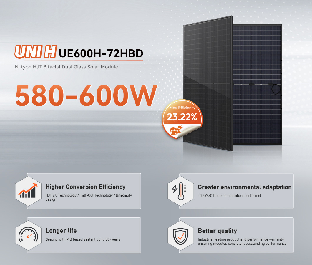 HJT is an abbreviation for Heterojunction Technology, representing an N-type monocrystalline double-sided solar cell. It boasts the advantages of simple processing, high power generation, and low cost per unit of electricity. It is poised to become an industry focal point following PERC cells. This type of solar cell was initially successfully developed in 1990, achieving a conversion efficiency of up to 14.5% for a 4mm2 cell at that time. Through continuous improvements, the conversion efficiency of HJT solar panels has reached 26.5% in 2022, with an average efficiency of 24.95% and a yield rate of 96.4%.